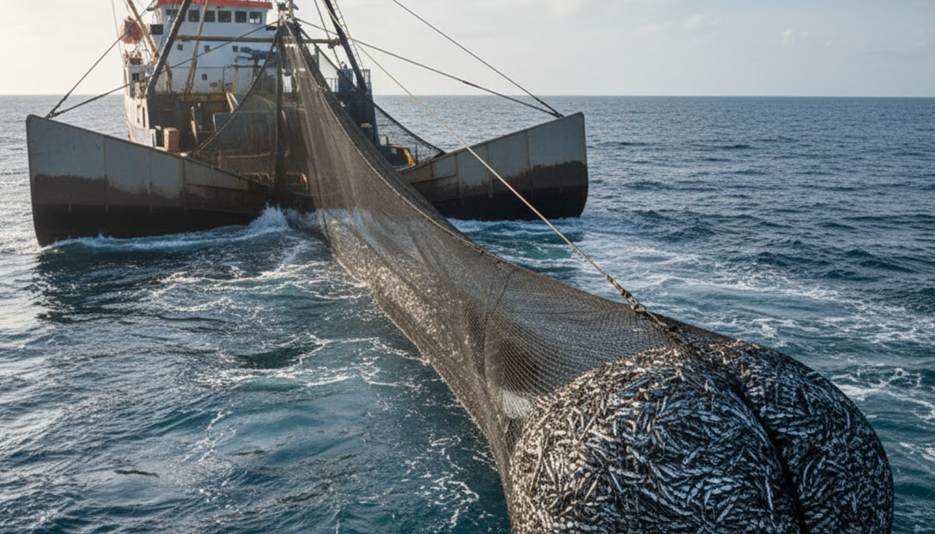船は3ノットという非常に低速で網を曳航します。この低速こそが、魚群を捕獲するのに最適な速度です。.