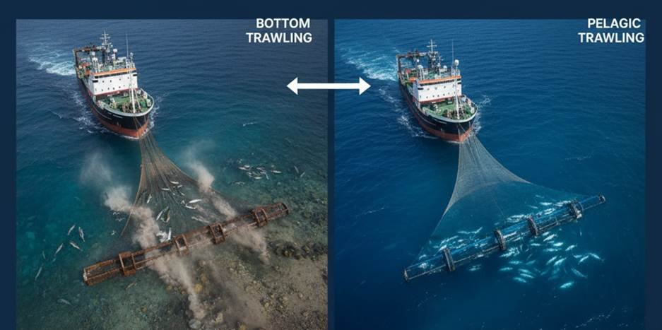 遠洋トロール漁法は、網を水中で「漁獲」する漁法です。海底との接触はありません。サバをターゲットとするため、漁獲量が少なく、漁獲が容易です。.