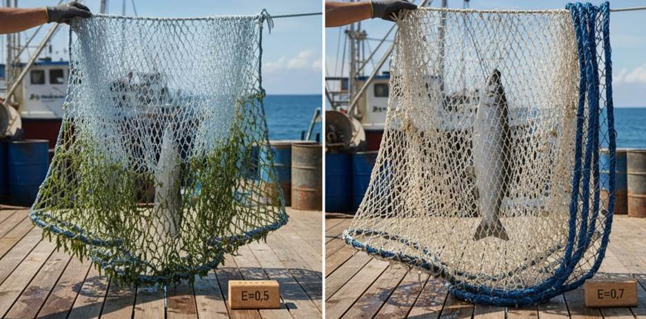 吊り下げ比(E)は重要な数値です。これは漁網の寸法と形状を表すもので、ロープの長さと張られた網の長さの比率です。0.5の比率では深いひし形になり、0.7の比率では幅の広い四角形になります。.