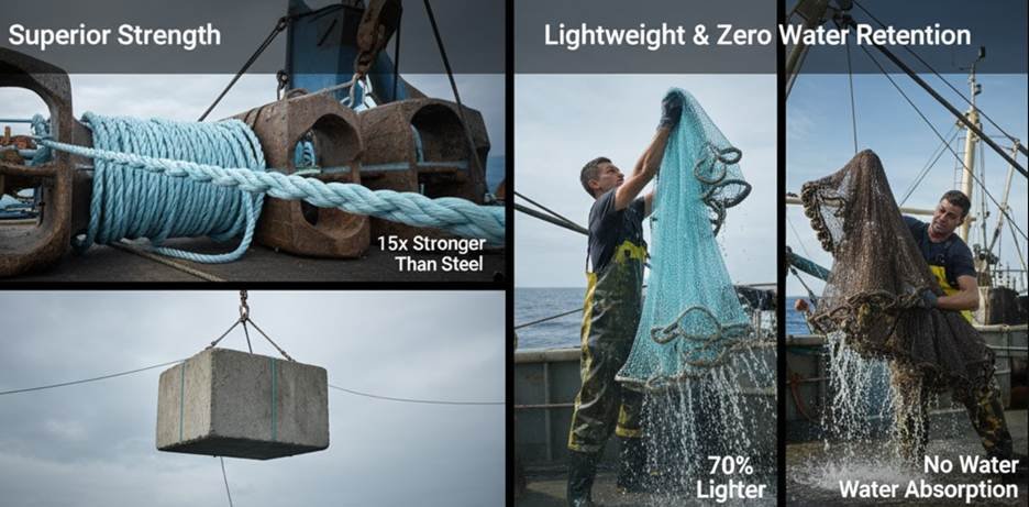 網のトロールワープもHMPEで作られています。このワープは鋼鉄よりも軽量です。これにより、網の設置が容易になり、網の性能が向上します。また、燃料の節約にもつながります。.