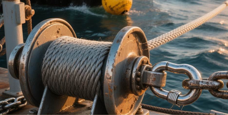 갑판 위의 이 기계들은 줄을 끌어올리거나 풀어줍니다. 4점 계류에는 최소 4개의 윈치 긴장을 조절하다.